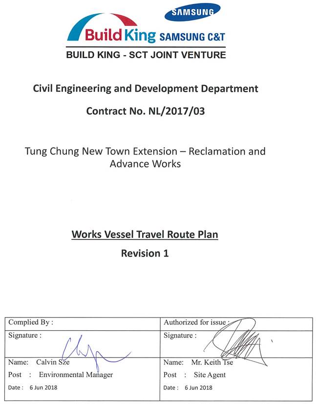 According to the scope of Contract, the following of works shall engage various type of works vessels in the construction of NL/2017/03. The particulars of works vessels is attached in Appendix A. Layout Plan showing Tung Chung East Reclamation Site, Southern Viaduct of TMCLK Link, Tung Chung Buoyed Channel and BMP is shown in Appendix B.