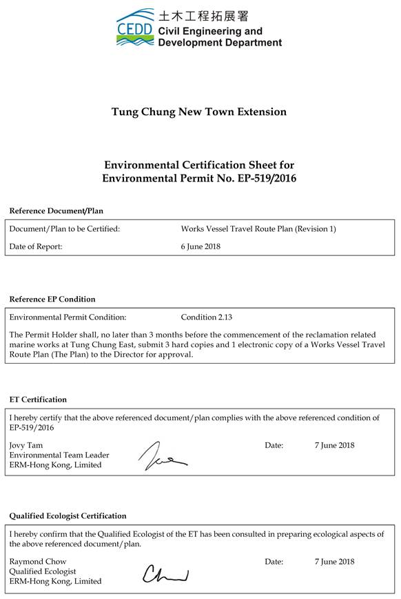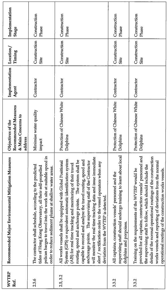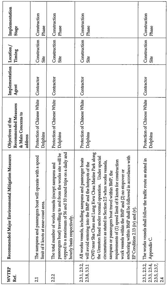 The potential impact of cumulative marine traffic disturbance or collision risk on dolphin due to large sized and slowly moving working vessels with relatively low traffic flow during towing are anticipated to be low. Nevertheless, speed limits and regular travel routes will be implemented to control and minimize marine traffic disturbance on dolphins. The supervising staff of the Contractor will record and control the trips to ensure not exceeding the daily and hourly trip basis. Moreover, good planning of construction vessel activities, minimize stationary/idle work vessels, reduction of waste materials will be implemented to minimize trips of the construction works vessels to and from the works site. The total number of works vessels (except sampans and passengers boat) travelling to and from the works site will be capped to a maximum of 56 and 10 round trips on a daily and hourly basis respectively.