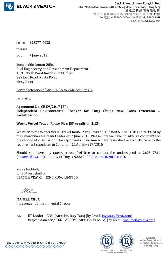 The Contractor will consider the hotspots of the Chinese White Dolphins near Sha Chau and Lung Kwu Chau Marine Park, along the Urmston Road as one of the design criteria of the Regular Marine Travel Routes. The latest Chinese White Dolphin distribution and abundance would be reviewed with reference to the latest Monitoring of Marine Mammals in Hong Kong Waters (2016-17) issued by AFCD. All works vessels will avoid travelling within the hotspots of the Chinese White Dolphin near Sha Chau and Lung Kwu Chau Marine Park along the Urmston Road under normal operation.