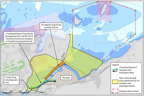 The Tung Chung Buoyed Channel falls into The Brothers Marine Park (BMP). Under normal operation and taken in consideration of restriction due to the BMP, arrival and departure route of the works vessels will generally enter the site via the navigation corridor either between the Boundary Crossing Facility and west boundary of BMP or between the south east boundary of the BMP and Siu Ho Wan. Besides, sampans and passengers boat would avoid entering into the BMP under normal operation.