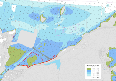 The contractor shall schedule, according to the predicted tides of Hong Kong Observatory, all their self-propelled pelican barges to travel into the work site at suitable speed in order to reduce sediment plume at shallow water areas. Figure 2.2 show the water depth within the site and around Lantau Island.