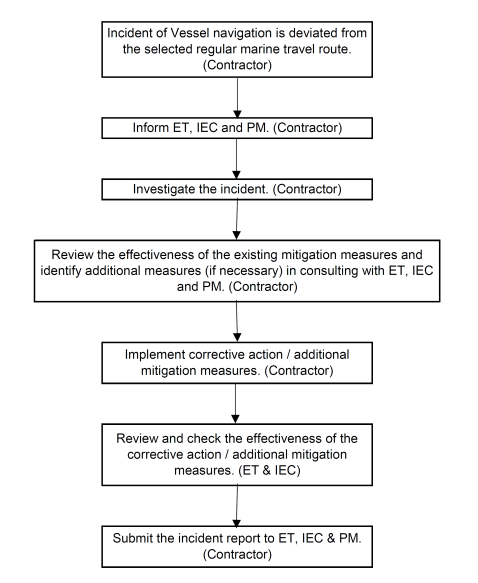 If there is any situation including local strong wind current and head-on large vessel affecting the marine safety and the vessels navigation is deviated from the selected regular marine travel route, the fleet captain shall notify the Marine Traffic Manger and the Environmental Officer shall report the incident to the Project Manager, ET and IEC.