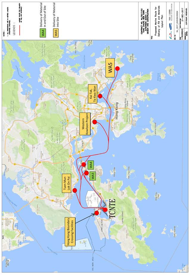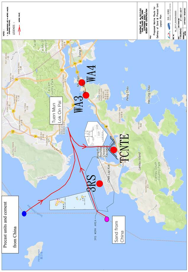 The marine travel routes for delivery of sandfill, rockfill, sorted public fill, precast unit, cement and materials for DCM is attached in Appendix C.