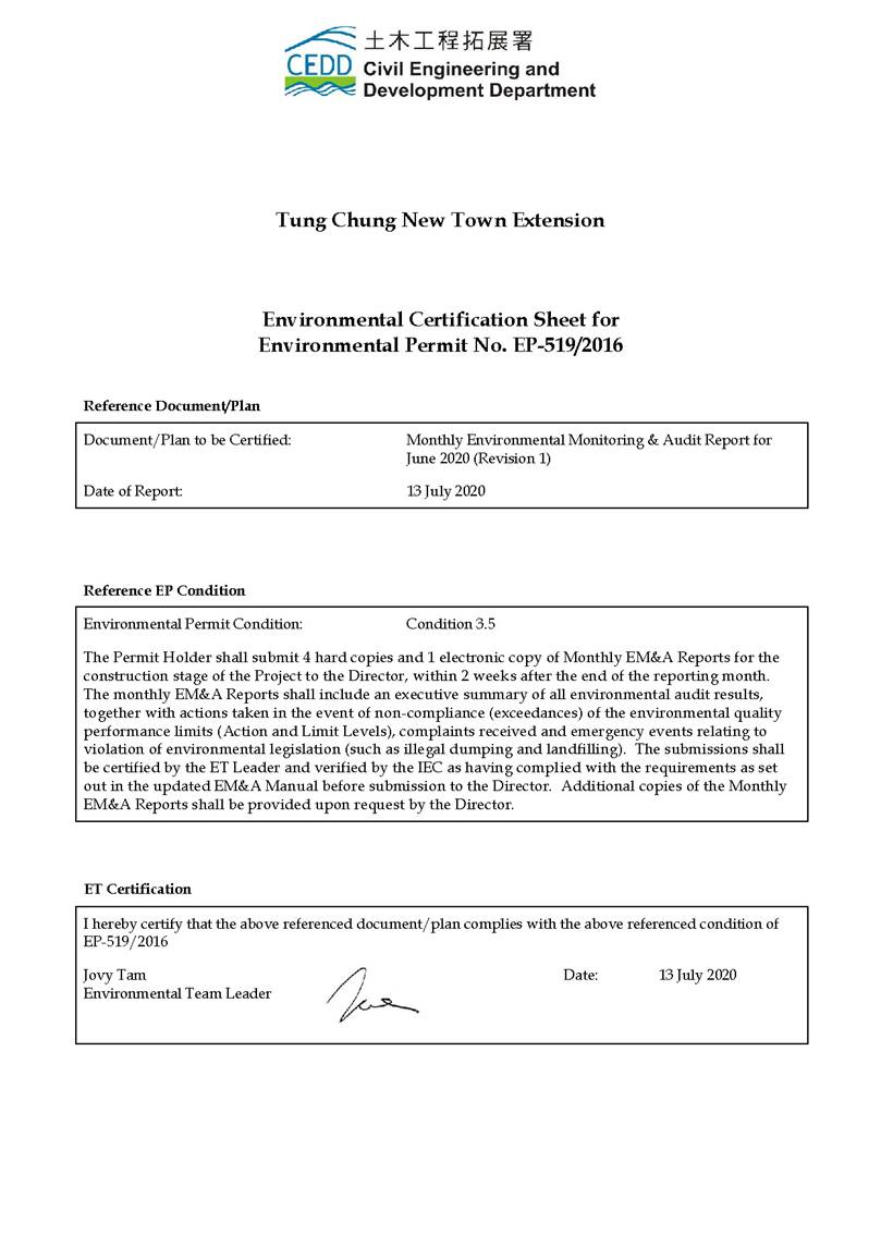 This EM&A Report presents the findings of the EM&A activities undertaken during the period from 1 to 30 June 2020 in accordance with the Updated EM&A Manual and the requirements of the Environmental Permit (EP-519/2016).
