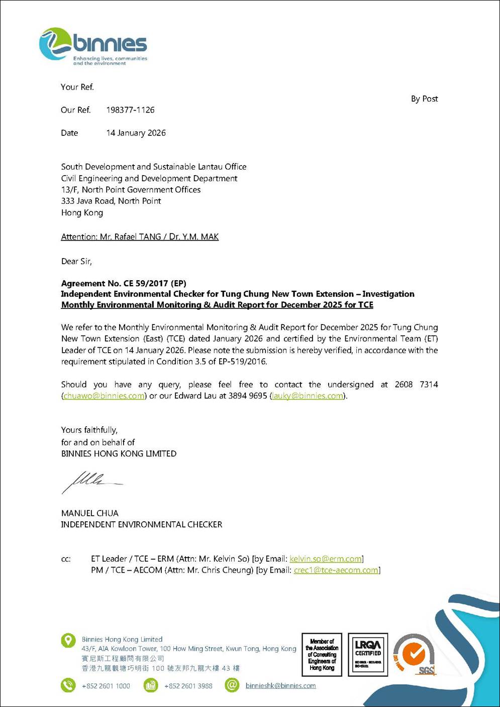 The ET will keep track on the construction works to confirm compliance of environmental requirements and the proper implementation of all necessary mitigation measures. The ET will also recommend to the Contractors about the environmental toolbox topics on the abovementioned key issues for the next reporting period.