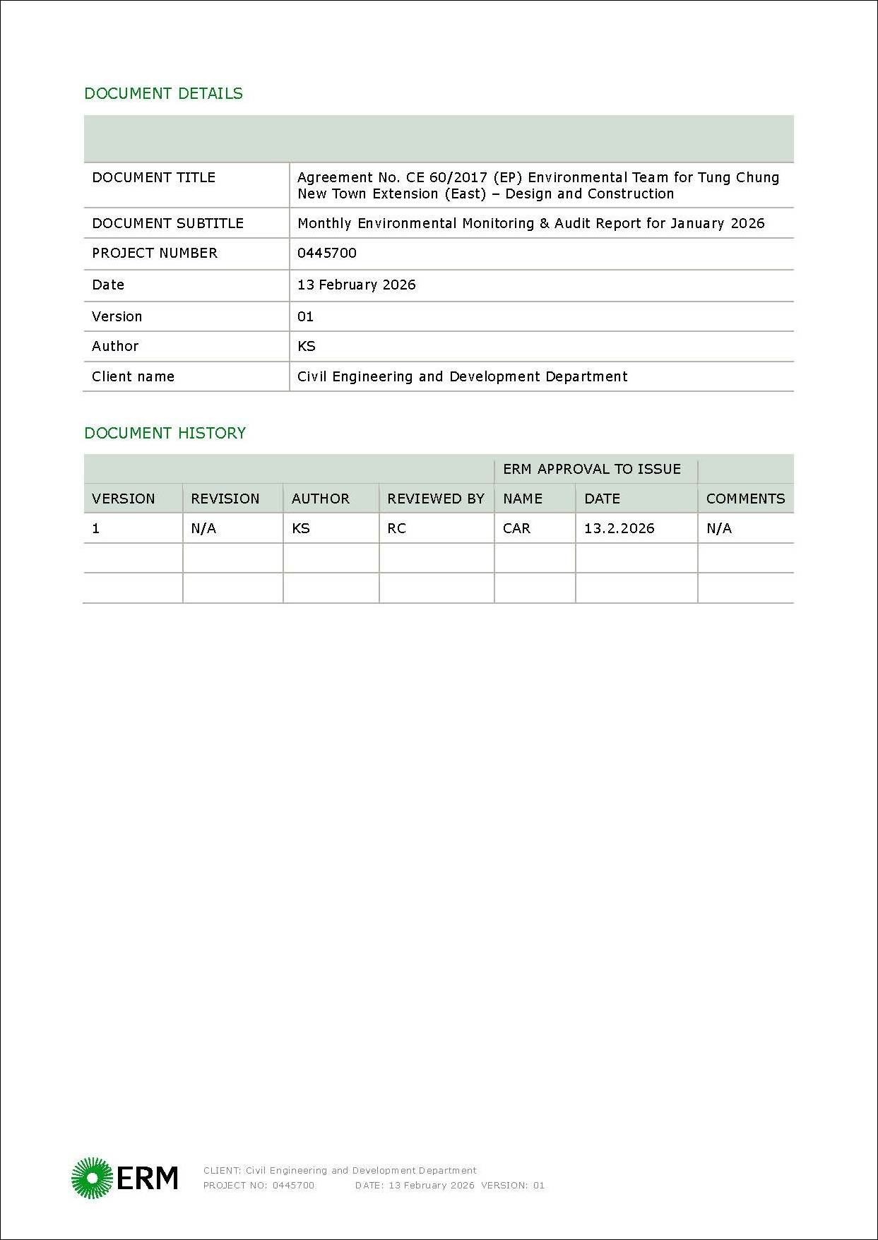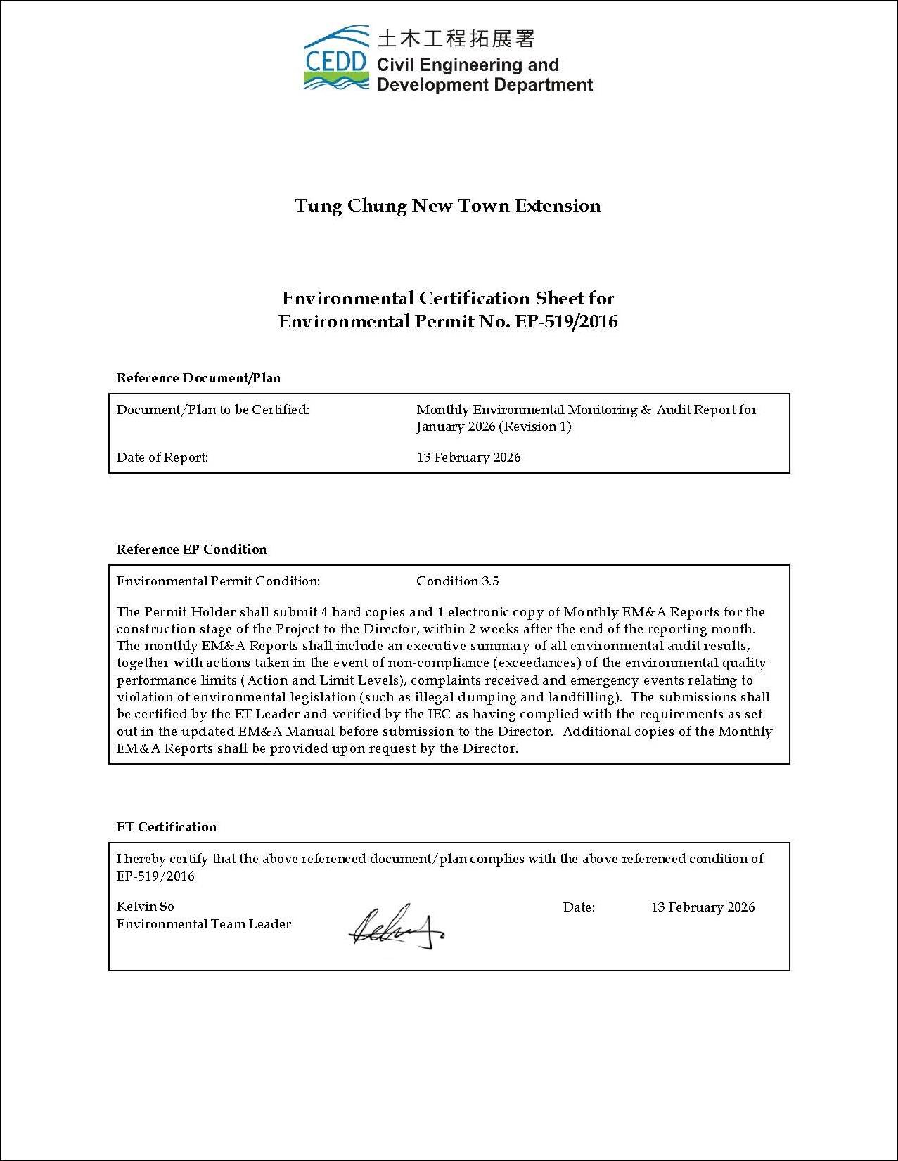 This EM&A Report presents the findings of the EM&A activities undertaken for the TCE Project during the period from 1 to 31 January 2026 in accordance with the Updated EM&A Manual and the requirements of the Environmental Permit (EP-519/2016).  The environmental monitoring, site inspection, environmental complaint handling and EM&A reporting in the works area in Area 113 occupied by MTRC will be covered by EM&A programme of TUE and carried out by existing ET and IEC of TUE.