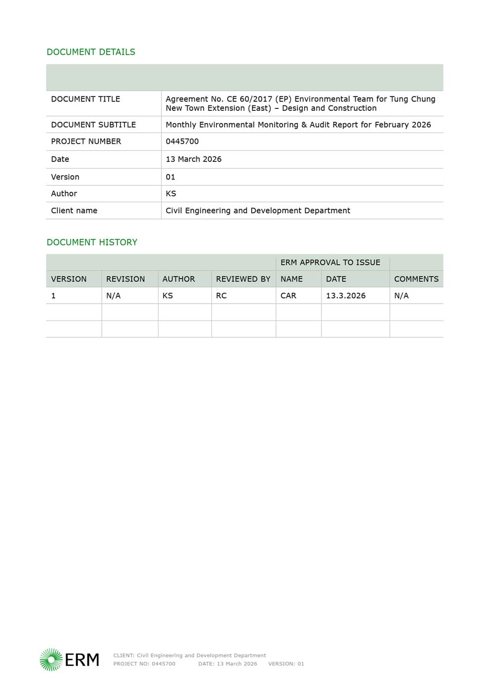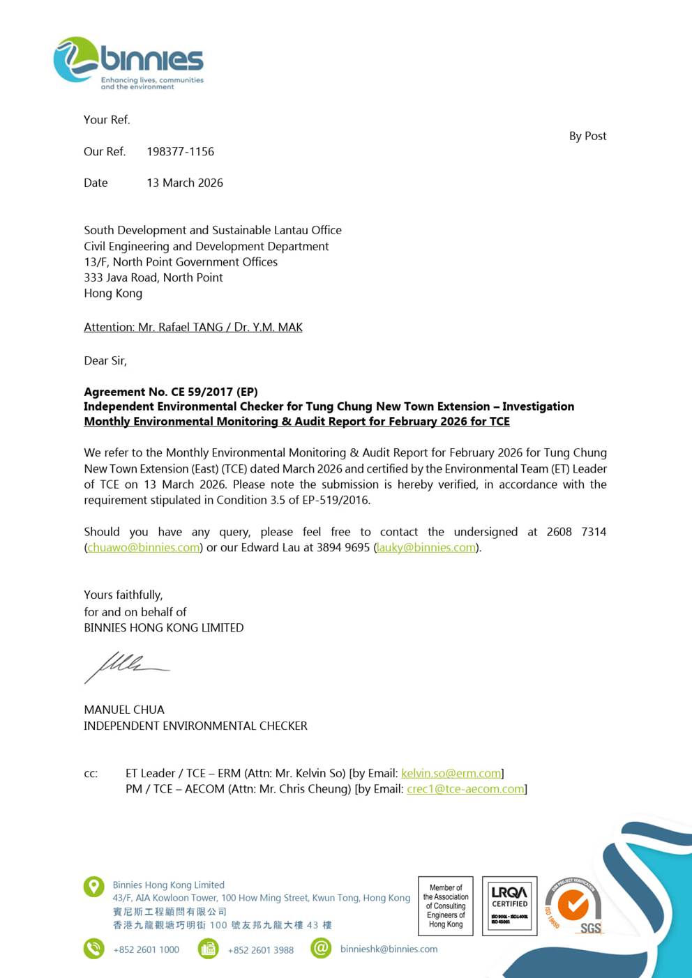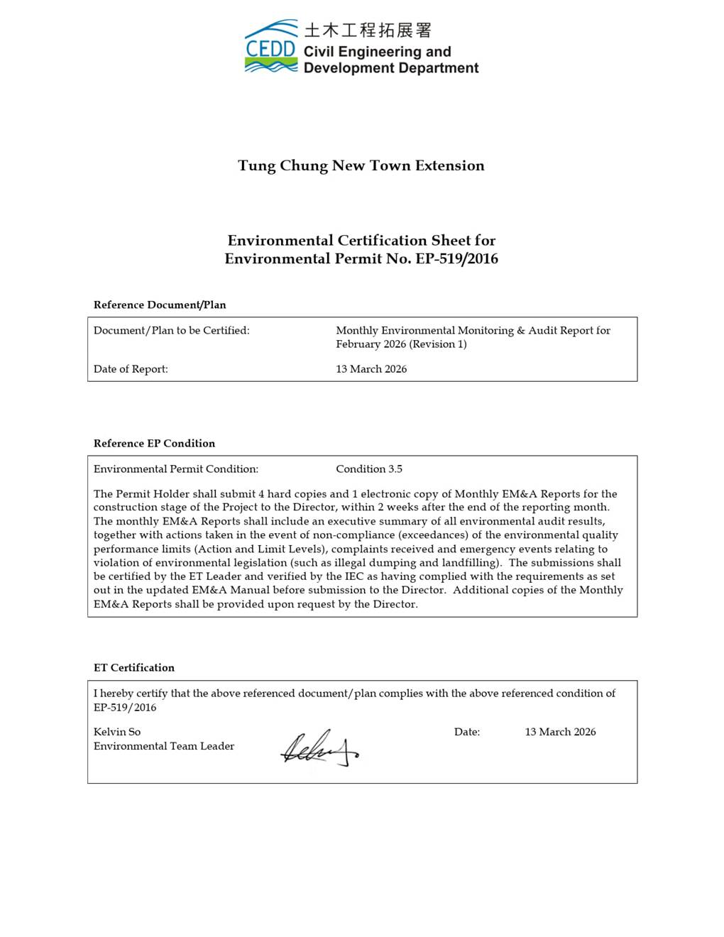 This EM&A Report presents the findings of the EM&A activities undertaken for the TCE Project during the period from 1 to 28 February 2026 in accordance with the Updated EM&A Manual and the requirements of the Environmental Permit (EP-519/2016). The environmental monitoring, site inspection, environmental complaint handling and EM&A reporting in the works area in Area 113 occupied by MTRC will be covered by EM&A programme of TUE and carried out by existing ET and IEC of TUE.